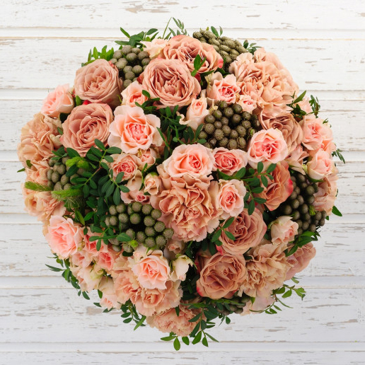 Нежный букет из французских роз и диантусов! Персиковые розы - 5 шт., Диантус - 5 шт., Кустовые розы - 3 шт., Салал для украшения.