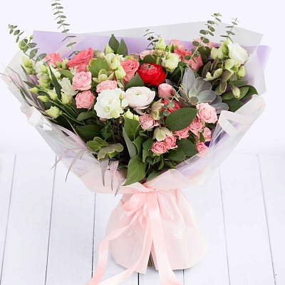 В его составе пушистые эустомы в бело-розовой гамме. Они смотрятся объемно, создавая впечатление охапки цветов. Эустома 15 шт, Эвкалипт 1 пуч