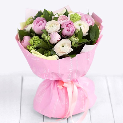 Букет из нежных персиковых пион! Пионы - 7 шт., Ранункуллус Супер Ханой - 5 шт., Вибурнум - 3 шт., Салал - 1шт., Упаковка - 2 шт.